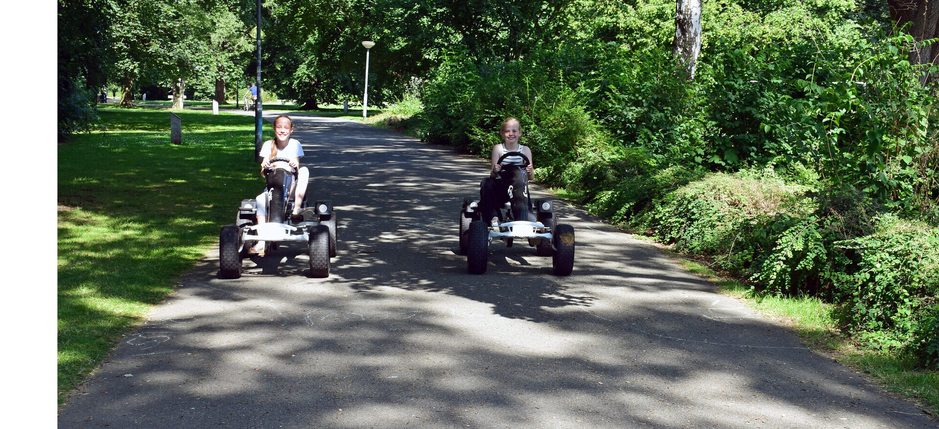Lea und Emilia bevorzugen das Aktivsein: Die beiden Freundinnen nehmen zum zweiten Mal an den Ferienerlebnistagen teil und fahren erst mal Kettcar unter schattenspendenden Bäumen. „Das ist richtig gut hier“, so die elfjährige Emilia. Die neunjährige Lea schließt sich an. „So können die Ferien bleiben.“