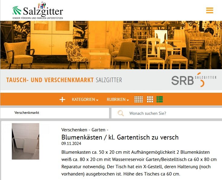 Eine schöne und auch nachhaltige Alternative zum Neukauf ist der Online-Tausch- und Verschenkmarkt, auf den der Städtische Regiebetrieb Salzgitter (SRB) zur Europäischen Woche der Abfallvermeidung, aufmerksam machen möchte. Diese Plattform bietet die Möglichkeit gebrauchte Gegenstände und Möbel zu verschenken, statt sie zu entsorgen. Weitere Kategorien wie leihen, reparieren und suchen leisten wertvolle Beiträge zur Abfallvermeidung, machen den Tausch- und Verschenkmarkt attraktiv und helfen, Abfall zu vermeiden.