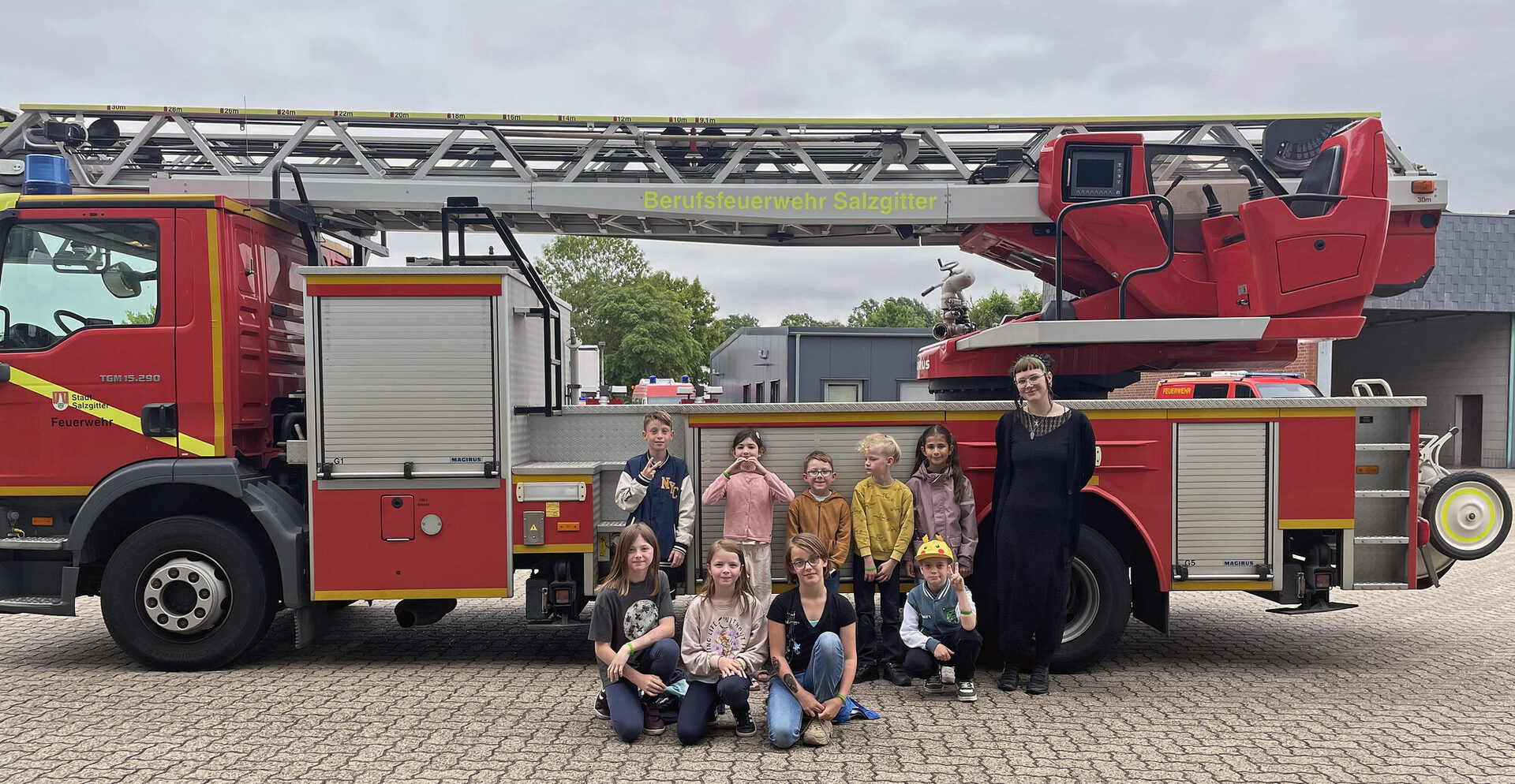 Der Besuch bei der Berufsfeuerwehr in Lebenstedt hat allen Beteiligten trotz leichten Regens großen Spaß gemacht und besonders die vielen unterschiedlichen Kranken- und Rettungswagen weckten das Interesse der Kinder. Am Ende der Führung durften sie mit der Rettungsleiter der Berufsfeuerwehr fahren. Zehn Meter hoch ging es, manche Kinder wären allerdings gerne noch höher gefahren. „Höher! Höher!“ und „Zugabe! Zugabe!“ schallte es über den Feuerwehrhof.