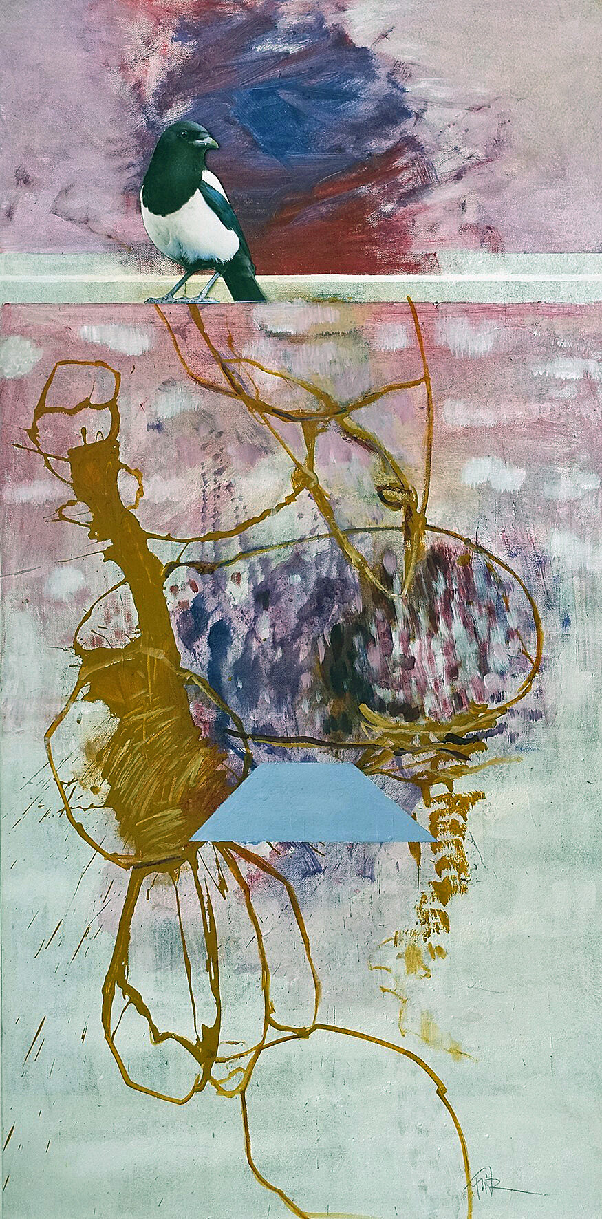 Die Zukunft oder das Ungewisse drücken sich in farbigen Flächen aus, aus denen die Inhalte erwachsen können und dann Gestalt annehmen. Ein Bild kann nach Aussage des Malers im Ganzen erfasst werden, doch bei längerer Betrachtung ziehen einzelne Elemente die Aufmerksamkeit an sich und Bilder in den Bildern entstehen.