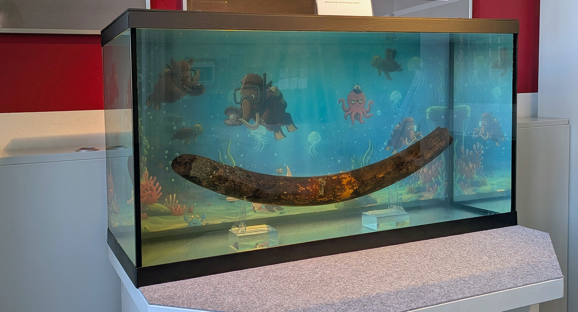 Das Team des Städtischen Museum Schloss Salder hat im Eingangsbereich des Schlosses eine neue Vitrine gebaut. Aber keine übliche – nein, der Stoßzahn liegt in einem umgebauten Aquarium! Denn der seltene Fund darf nicht austrocknen, weil er sonst reißen und brechen würde.