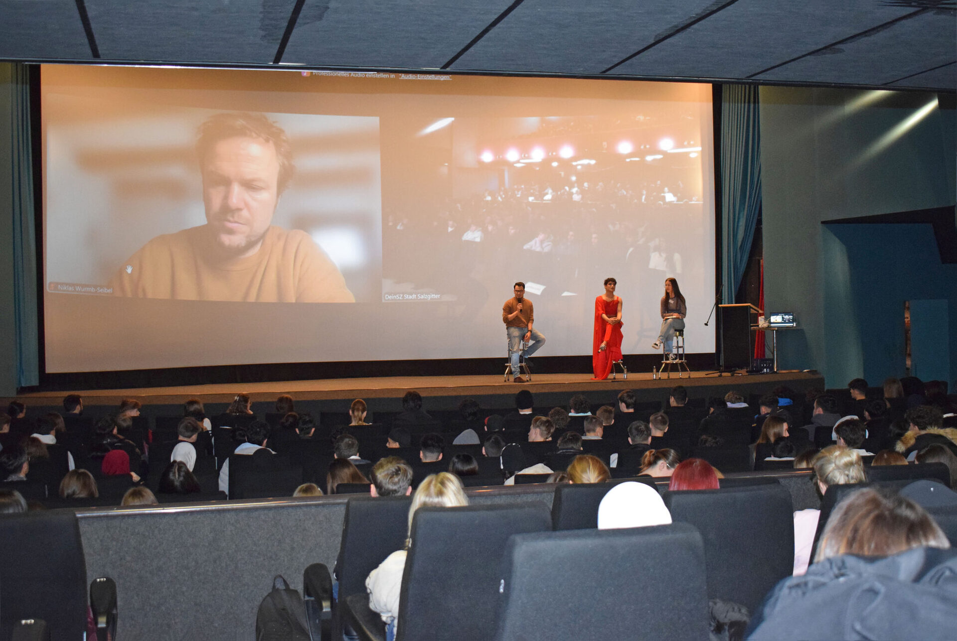 Anlässlich der Internationalen Wochen gegen Rassismus hat das Team Jugend- und Demokratiebildung der Stadt Salzgitter am vergangenen Dienstag weiterführende Schulen der Klassenstufen 9 bis 12 ins Kultiplex in Lebenstedt eingeladen. Gezeigt wurde der Dokumentarfilm „Wir sind jetzt hier“. Im Anschluss folgte ein Filmgespräch mit zwei Protagonisten des Films, Najib Faizi und Azim Fakhri, sowie dem Regisseur Niklas von Wurmb-Seibel. Rund 300 Schülerinnen und Schüler des Gymnasiums am Fredenberg, der Hauptschule Fredenberg, der Emil-Langen-Realschule und der IGS nahmen an der Filmvorführung teil.