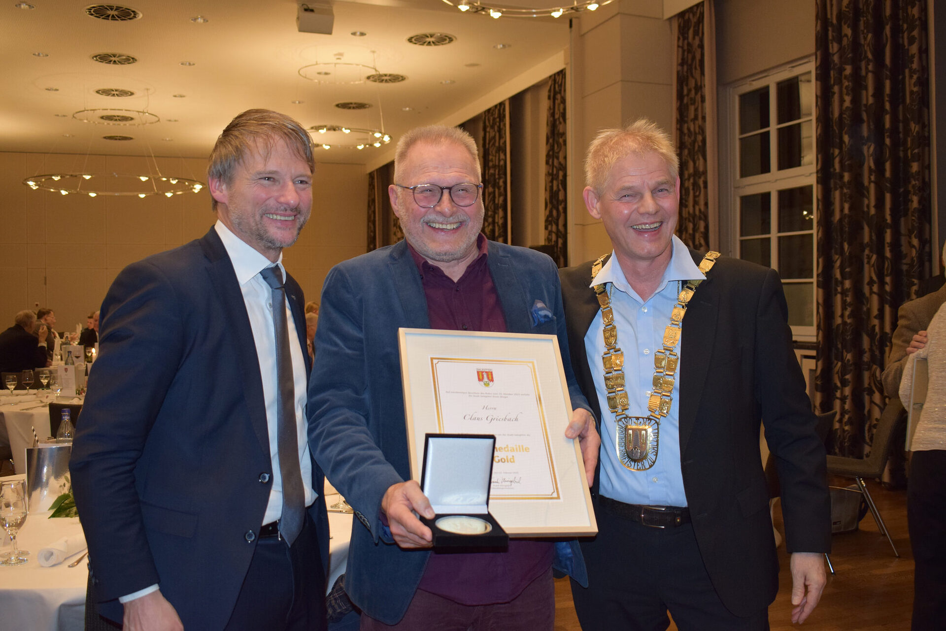 Verleihung der Stadtmedaille in Gold an Claus Griesbach (v. l. Erster Bürgermeister Stefan Klein, Stadtmedaillenträger Claus Griesbach und Oberbürgermeister Frank Klingebiel)