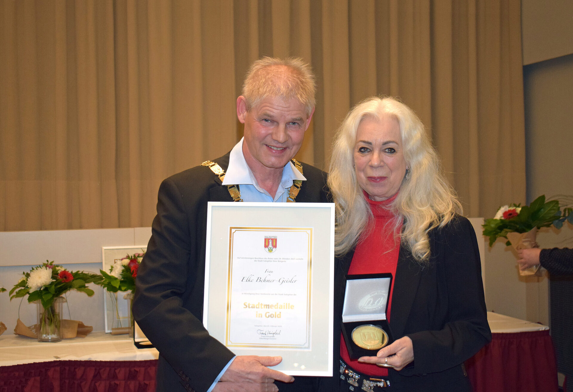 Verleihung der Stadtmedaille in Gold an Elke Behmer-Geisler (v. l. Oberbürgermeister Frank Klingebiel und Stadtmedaillenträgerin Elke Behmer-Geisler)