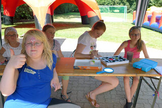 „Alles ist super“, sagt Laura, die sich heute ein glitzerndes Tattoo auf den Oberarm malen lässt. Die Zehnjährige hat bereits die erste Woche der Ferienerlebnistage besucht, die unter dem Titel „Farbenfroh“ abwechslungsreiche Aktivitäten beinhalteten. Hier sei immer was los, es macht Spaß, viele andere Kinder seien zum spielen da und das Essen schmecke auch gut… Das findet auch Ciara, die heute lieber im Schatten sitzt und nicht mit den anderen Fußball spielt. Die Zehnjährige freut sich auch immer auf die Ferienerlebnistage, die die Kinder- und Jugendtreffs der Kommunalen Kinder- und Jugendförderung der Stadt Salzgitter organisiert haben. Bei den Ferienerlebnistagen handelt es sich um drei jeweils einwöchige Betreuungsangebote für jeweils bis zu 100 Kinder im Alter von 6 bis 12 Jahren, die täglich von 8 bis 17 Uhr stattfinden (Programm täglich von 10 bis 12 Uhr und von 14 bis 16 Uhr) statt. Neben den verschiedenen Aktivitäten passend zu den Themenwelten gibt es weitere Angebote wie die Hüpfburg, Slagline oder Boßeln durch den Stadtpark.