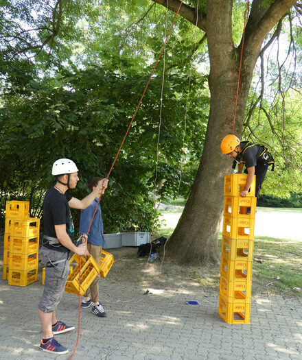 Als „rasender Reporter“ ist er für die „FETSZ-Zeitung“ unterwegs, die alle Kinder nach Abschluss der Woche mit nach Hause nehmen. So hält er die Begeisterung auch bei dem siebenjährigen Ali fest, der geschickt die Kisten stapelt und hoch klettert. Gut gesichert von André Greco ist die Höhe ein besonderes Vergnügen, auch wenn die zwölf Kisten dann doch wackeln und kurz darauf auseinanderfallen. Das Schweben in der Luft ist ein schöner Abschluss in der luftigen Höhe. Dann sind die anderen Kinder an der Reihe.