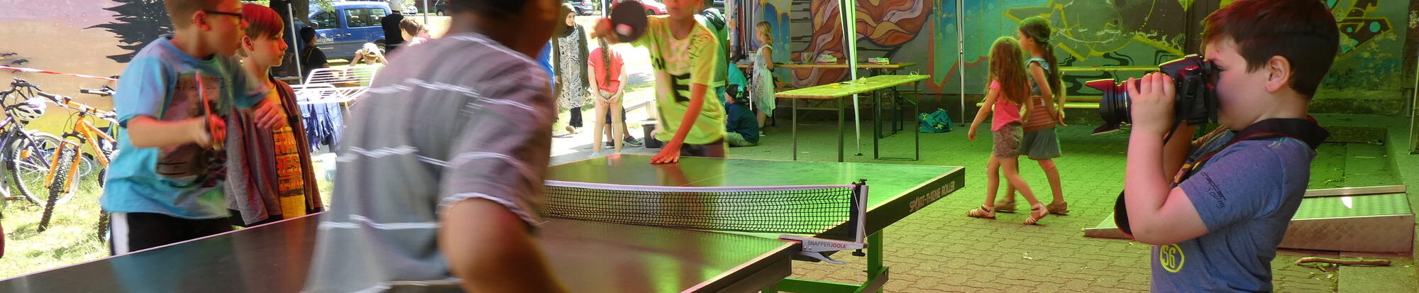 Bei herrlichem Sommerwetter sind viele Kinder draußen: Die Hüpfburg ist ebenso beliebt wie die Tischtennisplatte, die glücklicherweise im Schatten steht. Ein paar Meter weiter wird gekickt, während einige Mädchen und Jungen ganz andächtig in Eimern mit blauem Wasser rühren. Darin schwimmen T-Shirts, die einmal weiß waren. „Wir haben sie vorher an einigen Stellen mit Bindfäden abgebunden“, erklärt Lara. Diese Stellen bleiben dann weiß, wie die ersten Ergebnisse an der Wäscheleine zeigen. Batiken gefällt den Kindern ebenso wie das Miteinander mit den anderen Mädchen und Jungen. Zusammen spielen, Mittagessen und gemeinsam Neues probieren steht eine Woche lang im Mittelpunkt. Der siebenjährige Leander hält das alles in Text und Foto fest.