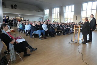 Stadtbaurat Michael Tacke ergänzte, dass die „Arche 4“ das vierte große städtebauliche Projekt in der Ost- und Westsiedlung sei, das mit Hilfe des Städtebauförderprogrammes Soziale Stadt entstanden ist, das von Bund, Land und Kommune finanziert wurde. Der Martin-Luther-Platz, der Roxy-Helco-Spielplatz und der Quartierspark an der Ziesbergschule seien die drei weiteren Meilensteine, die mit Städtebauförderungsmitteln entstanden seien. Die Maßnahmen der Hauseigentümerinnen und Hauseigentümer seien wichtig, aber auch das Engagement der Menschen vor Ort, die sich in der Ost- und Westsiedlung ehrenamtlich engagieren. Beeindruckt zeigte sich der Stadtbaurat von der baulichen Gestaltung der „Arche 4“, in der die Bewohnerinnen und Bewohner viel bewegen können. „Besonders gut gefällt mir die Idee der Kirchengemeinde, an der Eingangstür Wünsche der Beiratsmitglieder anzubringen“, sagte Michael Tacke. Die Stadt Salzgitter habe sich für den Spruch von Gottfried Keller entschieden: „Wo das Glück einmal eingekehrt, da greift es leicht um sich.“ Diesem Wunsch schloss sich der Stadtbaurat gern an und wünschte der „Arche 4“ viele gute Fahrten.