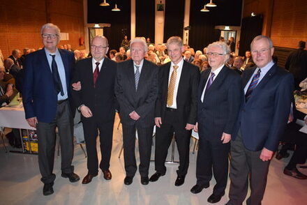 Als Zeitzeugen der jungen Geschichte der Stadt hatte der Oberbürgermeister die Ehrenbürger Hermann Struck und Rudolf Rückert, die Oberstadtdirektoren a. D. Dr. Hendrik Gröttrup und Detlef Engster sowie Oberbürgermeister a. D. Helmut Knebel zu einer spannenden und unterhaltsamen Podiumsrunde eingeladen.