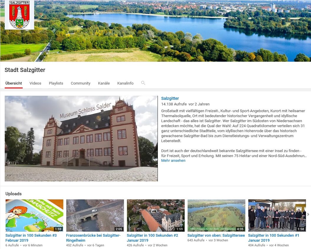 Bei Youtube hat der Kanal der Stadt Salzgitter im Jahr 2018 die Grenze von 1,25 Million Filmaufrufen überschritten. 1.687 Nutzer haben ihn abonniert, um kurzfristig über neue Filme der Stadt informiert zu werden.
