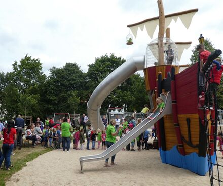 Mit einem großen Spielschiff wurde das Thema des Spielplatzes aufgegriffen und umgesetzt. Mit unterschiedlichen Elementen (Rutsche, Ausguck, Brücke etc.) ausgestattet, bietet das Schiff hohen motorischen und kreativen-sozialen Spielwert.