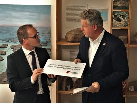 Bevor es zur Auszeichnung zum "Außerschulischen Lernort" im Geopark nach dem BNE-Konzept (Bildung für nachhaltige Entwicklung) kam, wurde das Bildungs-Konzept des Schlosses Salder zunächst von Dr. Renate Sievers-Altermann von der Landesschulbehörde geprüft. Im August 2019 wurde dann der Sammelantrag vom Kultusministerium in Hannover positiv beschieden.
