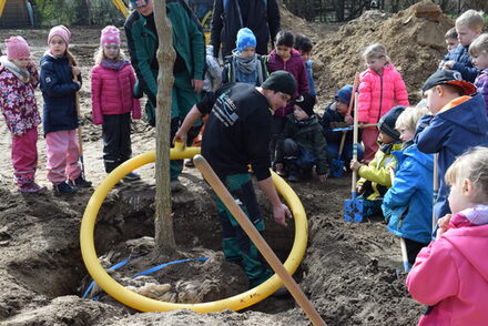 Die Mitarbeiter der Gartenbaufirma "Gala Bau Detlef Reinert" setzten zunächst großes Gerät ein, um den Trompetenbaum in das Pflanzloch zu setzen. Aus sicherer Entfernung beobachteten die kleinen Helferinnen und Helfer diese Aktion.