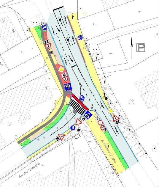 - Die Breslauer Straße wird vorfahrtsberechtigt. Alle gegenwärtig erlaubten Fahrbeziehungen am Knoten An der Erzbahn / Breslauer Straße sind auch zukünftig möglich.