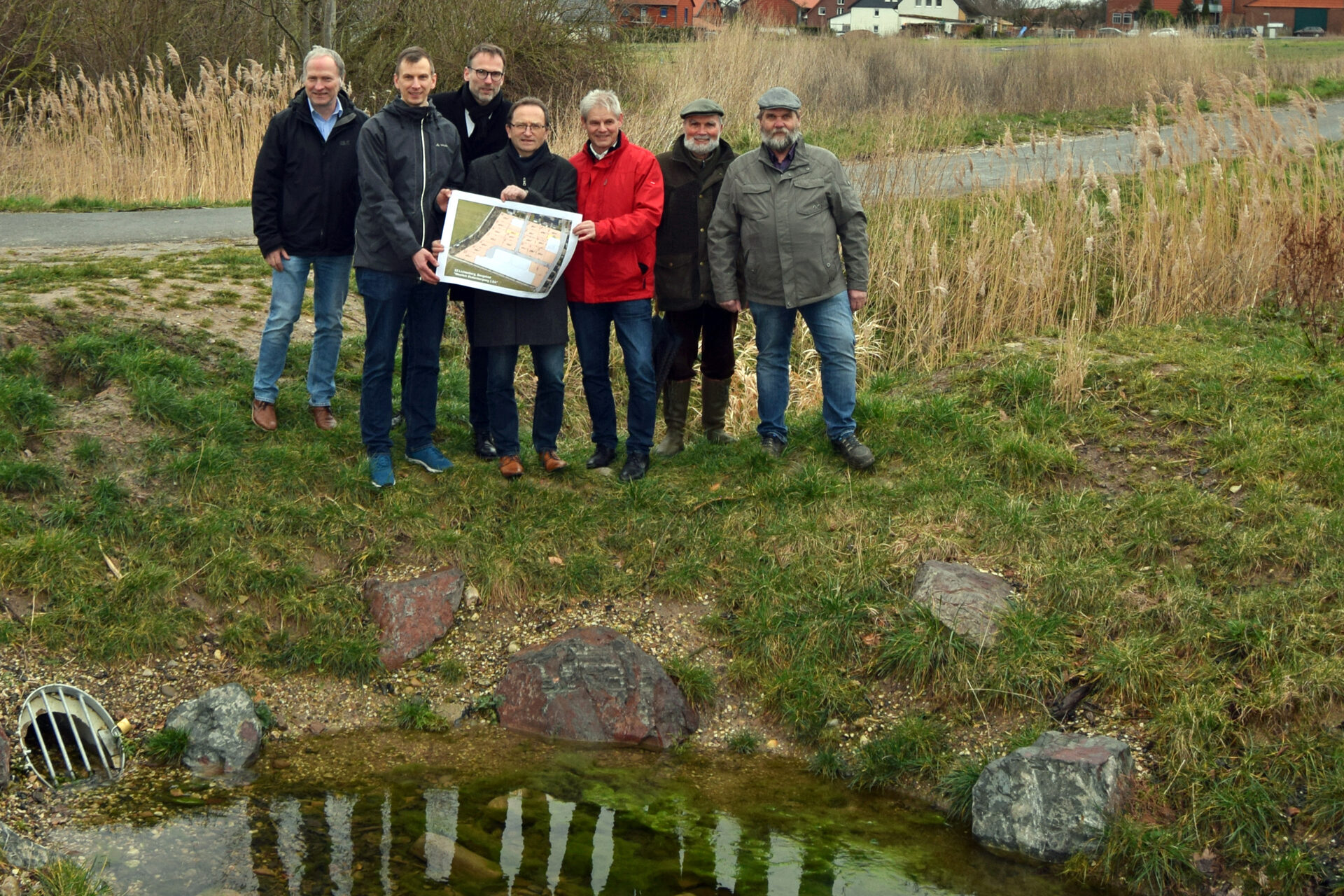 Oberbürgermeister Frank Klingebiel machte sich gemeinsam mit Baudezernent Michael Tacke, Betriebsleiter Eigenbetrieb Salzgitter Grundstücksentwicklung (SZGE), Gerard Jaschkowitz; Fachgebietsleiter Umwelt, Michael Buntfusz; SZGE-Mitarbeiter Bjoern Lewandowsky von der Stadt Salzgitter und Wilfried Schaper-Jesussek von der Feldmarkinteressenschaft vor Ort einen Eindruck von dem Baugebiet und der dazugehörigen Ausgleichsmaßnahme.