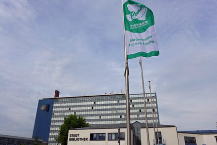Aktualisiert im März 2022: Aufgrund des Ukraine-Krieges weht die Fahne der "Bürgermeister für den Frieden" (Mayors for Peace) derzeit vor dem Rathaus in Salzgitter.