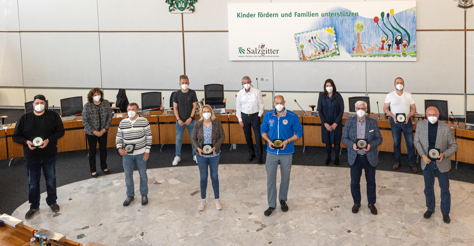 Im zweiten Teil der Ehrung verlieh Oberbürgermeister Frank Klingebiel eine Plakette in Gold an Björn Lippold sowie insgesamt sechse Plaketten in Silber an Bettina Cassel, Klaus-Dieter Gerke, Heinz Hannich, Ralph Hirschfeld, Christian Schum sowie an Peter Siems. Die Veranstaltung fand im kleinen Kreis und unter strenger Einhaltung der Abstands- und Hygieneregeln im Ratssaal des Rathauses statt.