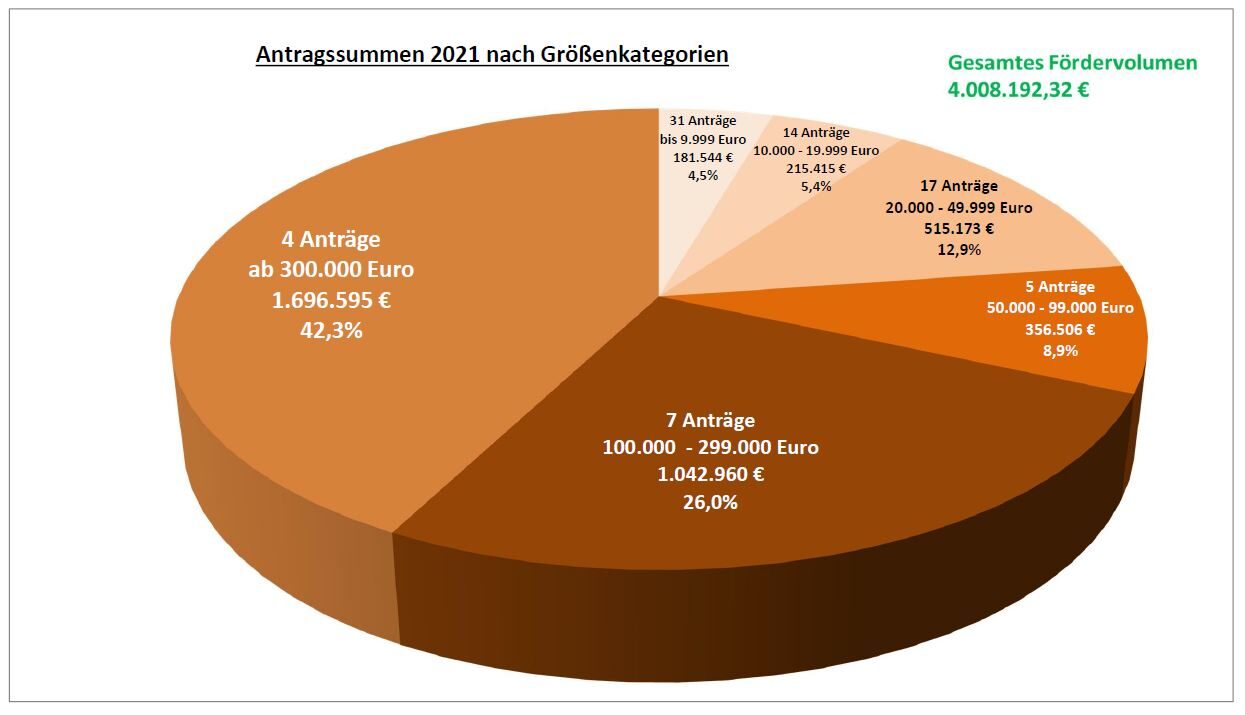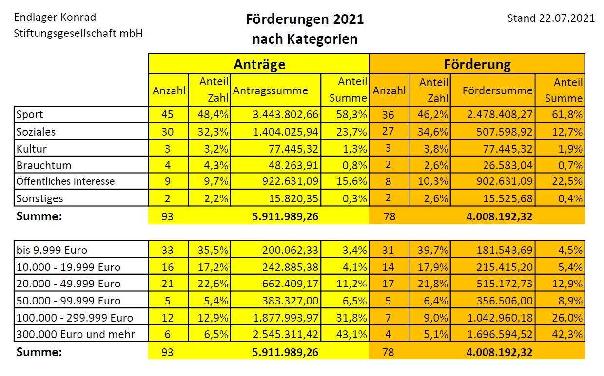 Die sieben größten Förderungen ab 150.000 Euro gehen von 164.800 Euro für eine Sanierung des Stadions des Sportvereins Glück Auf Gebhardshagen bis zu 640.000 Euro für den Neubau der Wasserrettungsstation am Salzgittersee des DLRG-Lebenstedt. Eine Liste der geförderten Projekte sowie Graphiken zur Aufteilung der Förderungen liegen bei.
