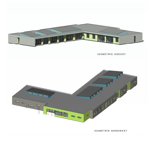 Das eingeschossige Gebäude soll in massiver Bauart wärmegedämmt errichtet werden. Die Bereiche Kindergarten und Kinderkrippe sind durch den zentralen Gemeinschaftsbereich mit den Verwaltungsräumen, der Essensversorgung, dem Bewegungsraum und dem Elterntreff voneinander getrennt.