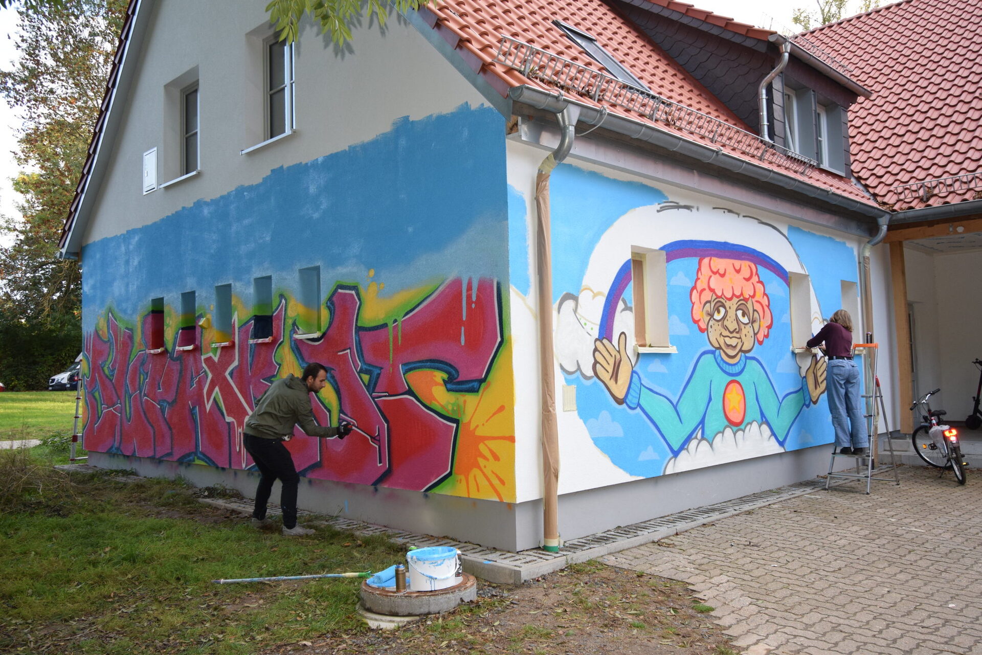 Die Ideen für die Graffitis sind ebenfalls Resultat der Beteiligungsaktion. An einer Wand begrüßt ein menschliches Wesen die Besuchenden. Ein Regenbogen soll die menschliche Vielfalt auf der Welt und im Treff unterstreichen. An der anderen Wand soll der Stadtpark in Comicversion umgesetzt werden.