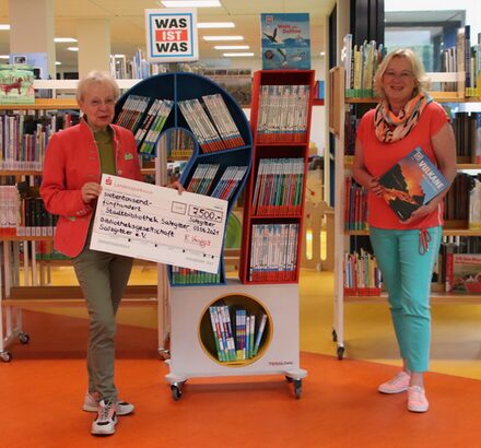 Bei der Übergabe des Schecks stellte Barbara Henning, stellvertretende Bibliotheksleiterin, die ersten Anschaffungen vor: Ein Präsentationsregal für die „Was ist was“ Buchreihe, ein neuer Bilderbuchtrog sowie ein kindgerechtes Regal zur Ausstellung der Tonies.