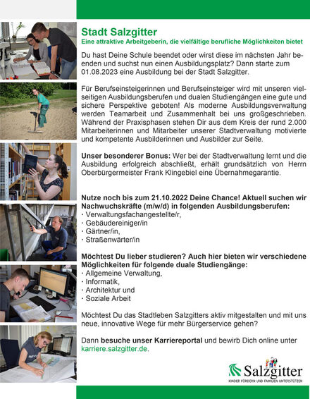 Wer bei der Stadtverwaltung lernt und die Ausbildung erfolgreich abschließt, erhält grundsätzlich von Oberbürgermeister Frank Klingebiel eine Übernahmegarantie. Weitere Informationen zur Ausbildung telefonisch unter 05341 / 839-3786 sowie per E-Mail ausbildungstadt.salzgitterde.