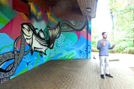 Wo bisher nur einzelne unzusammenhängende Graffitis die Wände geziert hatten, ist zum Beispiel im Eingangsbereich - passend zum Namen der Jugendkulturwerkstatt - eine riesige in Tentakeln gefangene Forelle zu sehen. Auch die Rückseite ist jetzt bunt gestaltet.