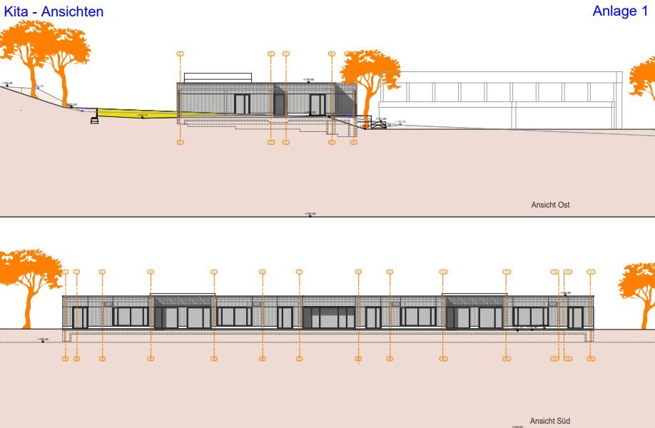 - Kindertagesstätte: Der Bau wird eingeschossig und rechteckig (Abmessungen 63 Meter x 18,7 Meter) mit Innenhöfen für die einzelnen Gruppen errichtet. Geplant sind folgende Funktionsbereiche: Speiseraum mit Küche, Verwaltungsbereich, Kindergartenbereich und Krippe mit Gruppenräumen und Ruhebereichen. Außenwände und Dach werden ähnlich umgesetzt wie beim Bau der benachbarten Grundschule.