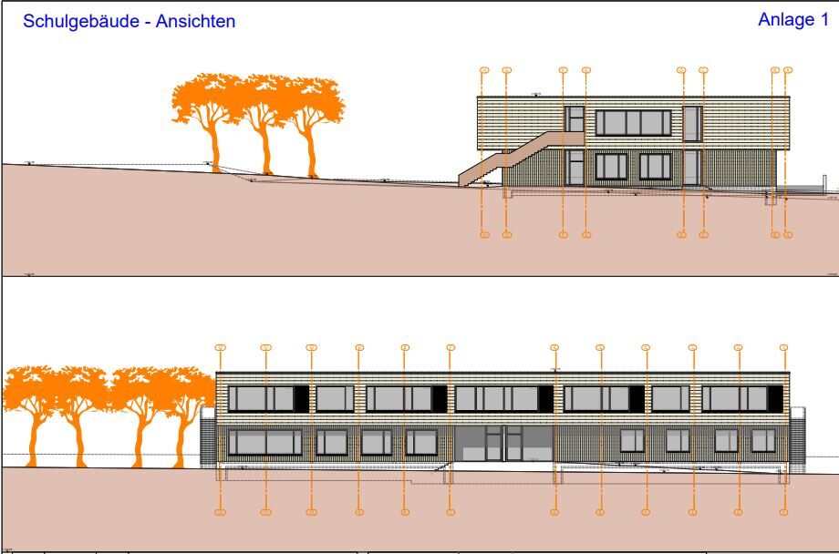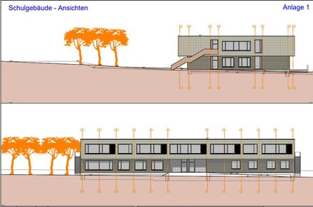 - Grundschule: Der zweigeschossige Neubau (Abmessungen 53 Meter x 29 Meter) soll in konventioneller Bauweise umgesetzt werden. Über ein Foyer soll der Bau erschlossen werden. Dort wird es eine Mensa geben, die auch als Veranstaltungsraum für bis zu 199 Personen dienen kann. Im Obergeschoss befinden sich die Unterrichtsräume. In Richtung Osten kann die Grundschule bei Bedarf zur Dreizügigkeit erweitert werden. Die Außenwände erhalten eine Holzverschalung aus Lärchenholz auf mineralischer Dämmung. Das Dach wird als Flachdach mit Kies oder Dachbegrünung umgesetzt.