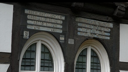 Vier rätselhafte Buchstabenzeilen findet man über einer ehemaligen Tür des Gebäudes. Es ist das Chronogramm.