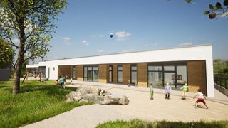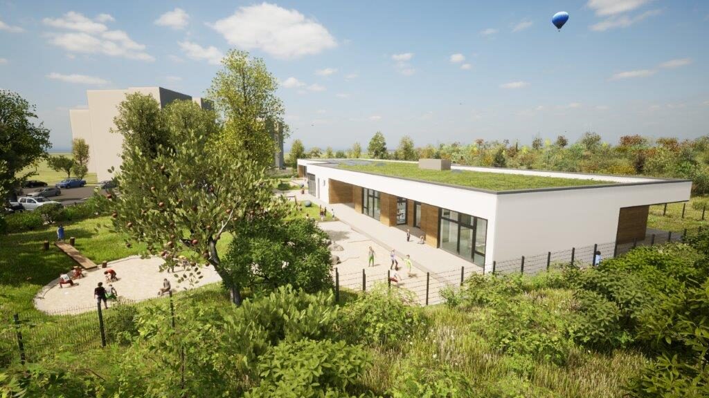 Das geplante Kita-Gebäude „Am Brotweg“ (etwa 40 Meter x 18 Meter) ist als eingeschossiges, kompaktes und barrierefreies Gebäude geplant und bietet Platz für 30 Krippenkinder und 50 Kindergartenkinder.