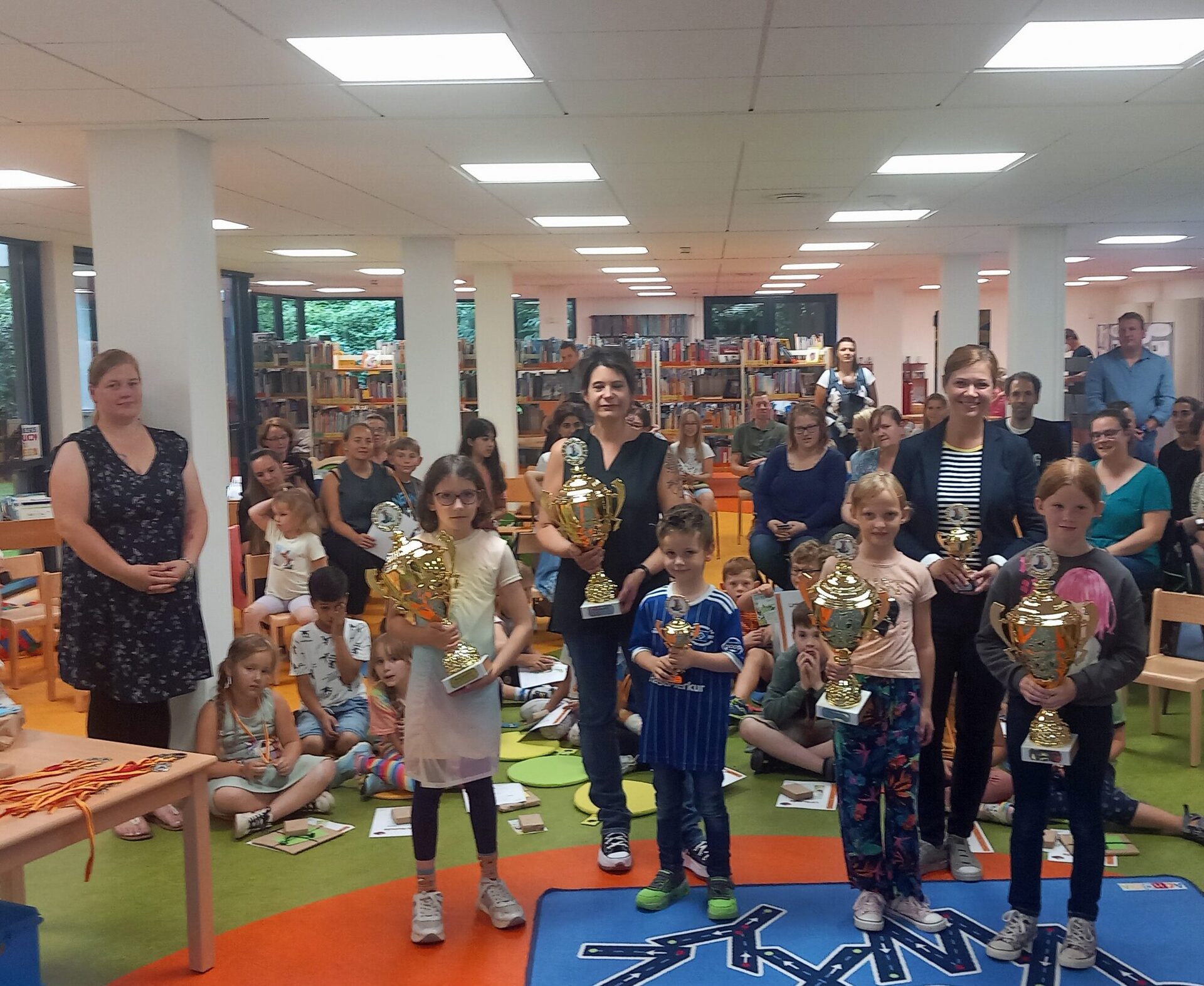 Beim Abschlussfest gab es ein kleines buntes Rahmenprogramm für die Kinder, bevor sie dann ihre Urkunde und ihre Preise erhalten haben. Da jedes einzelne gelesene Buch für Kinder eine tolle Leistung ist, bekamen alle Kinder eine Urkunde, eine Medaille und einen kleinen Preis. Die besten Leser jeder Klassenstufe erhielten einen Extra- Preis und einen Pokal.