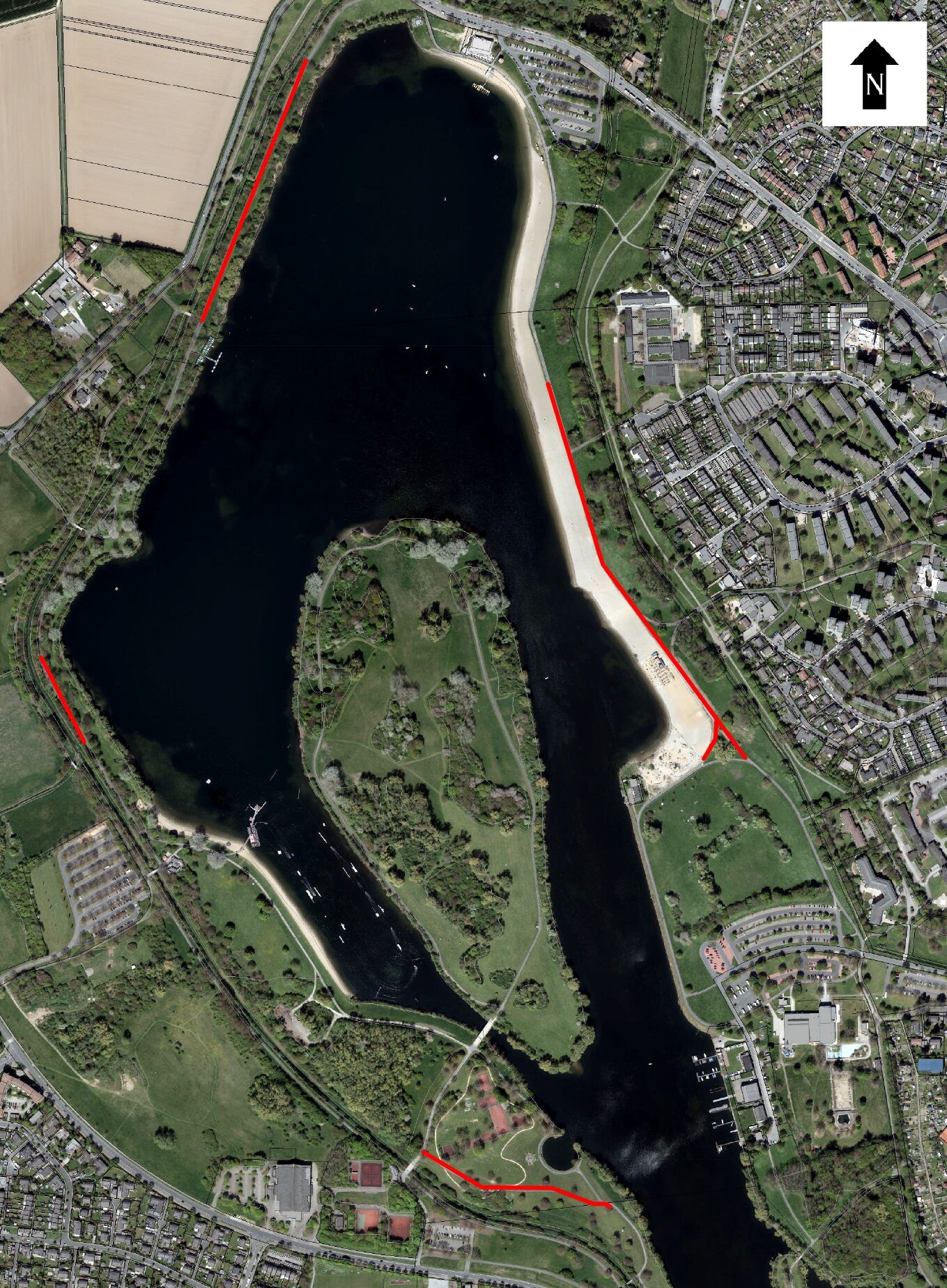 Die Bauarbeiten betreffen am Ostufer den Wegeabschnitt vom Piratenspielplatz in Richtung Norden, zwei Wegeabschnitte im Bereich Westufer, sowie einen Abschnitt im Bereich der Freisportanlagen.