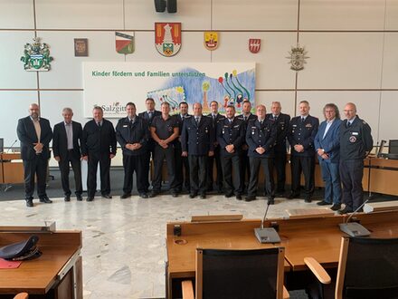 Mit anwesend waren neben vielen der zu ernennenden Ehrenbeamten auch der Vorsitzende des Ausschusses für Feuerwehr und öffentliche Ordnung Frank Miska und sein Stellvertreter Otto Kracht, Feuerwehrdezernent und Erster Stadtrat Eric Neiseke, Stadtbrandmeister Detlev Söhler mit weiteren Vertretern des Stadtkommandos sowie der Vertreter der Berufsfeuerwehr Salzgitter Torsten Preuß.