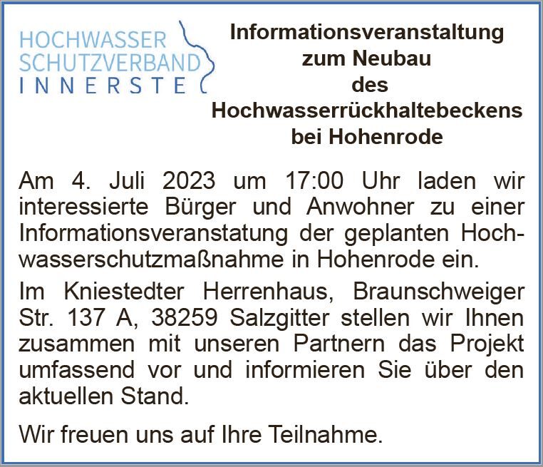 Zum Neubau des Hochwasserrückhaltebeckens bei Hohenrode findet am Dienstag, 4. Juli, 17 Uhr eine Info-Veranstaltung statt.