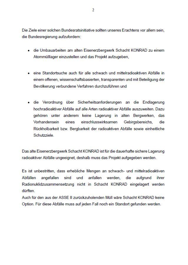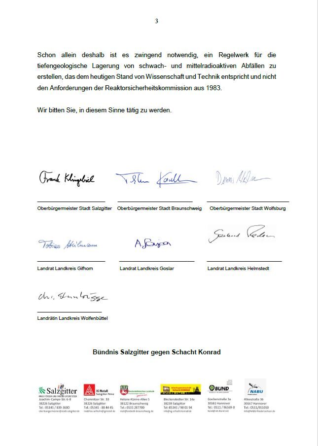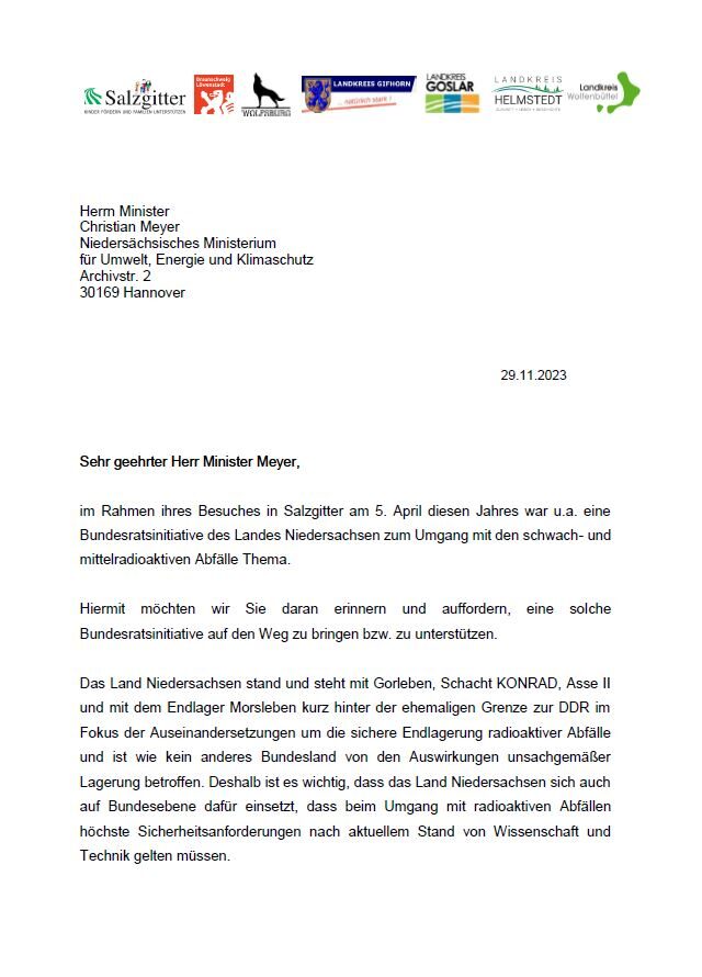 In einem offenen Brief fordern Oberbürgermeister Frank Klingebiel, sechs Amtskolleginnen und -kollegen aus der Region sowie das Bündnis gegen Schacht Konrad Niedersachsens Umweltminister Christian Meyer zu einer Bundesratsinitiative zum Umgang mit schwach- und mittelradioaktiven Abfällen auf.
