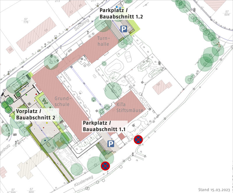- Anschließend (voraussichtlich ab Ende April) werden angrenzend an die Sporthalle am Schulring die Stellplätze erweitert. Die Arbeiten werden voraussichtlich nach vier Wochen (Ende Mai) abgeschlossen sein (Bauabschnitt 1.2).