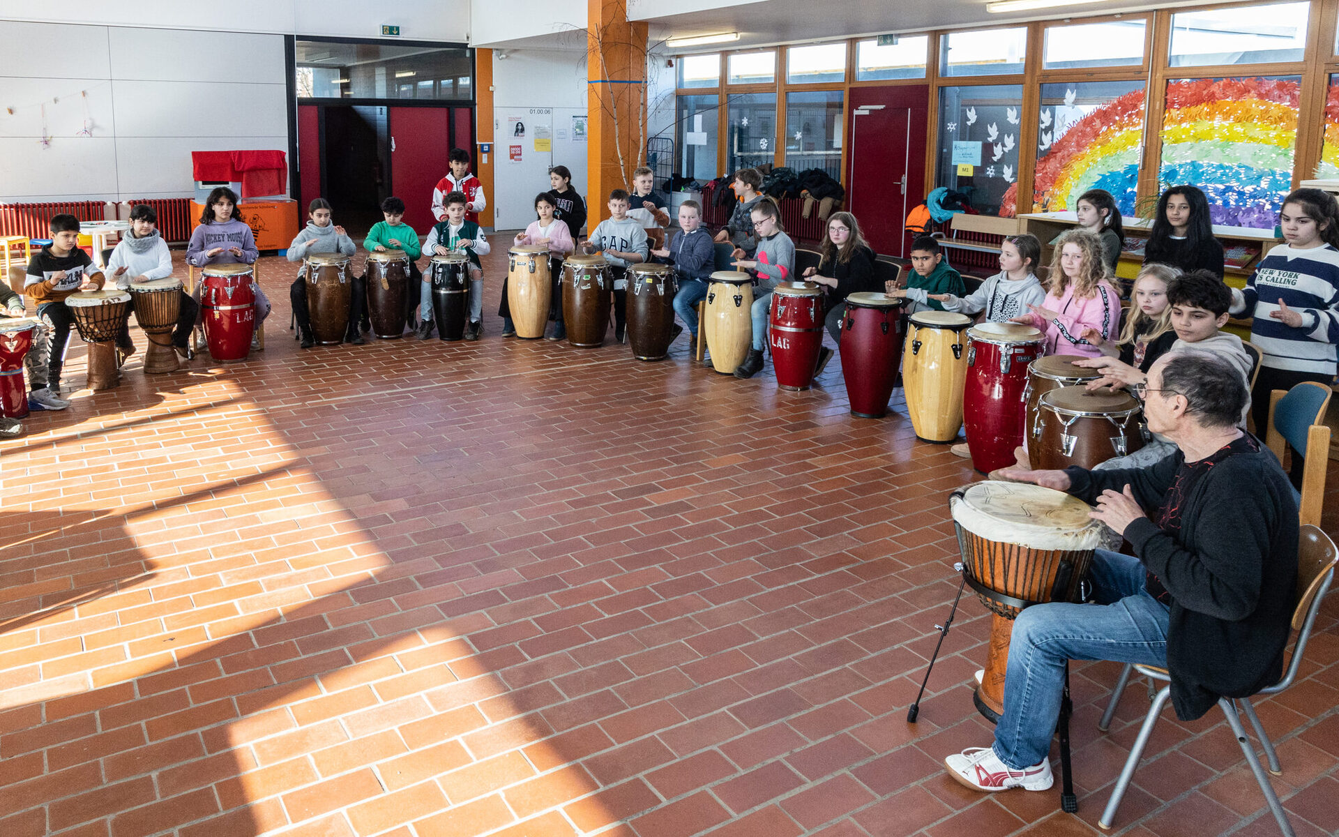 Jede Klasse hatte auf ihrer musikalischen Reise ein anderes Ziel wie beispielsweise Guinea, Senegal oder Caracas. Aus dem jeweiligen Land wurde ein mehrstimmiger Rhythmus erarbeitet und am Ende des Workshops der gesamten Schule präsentiert.