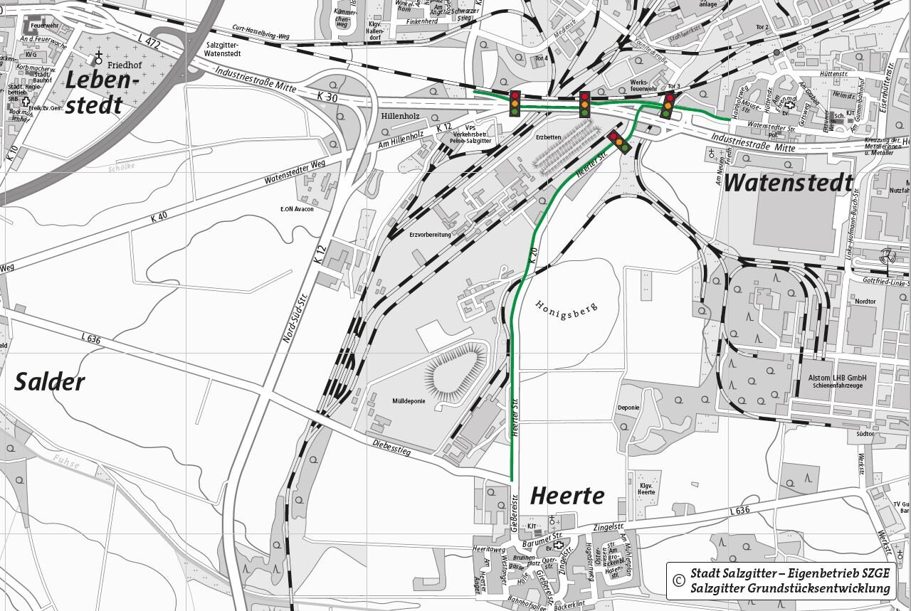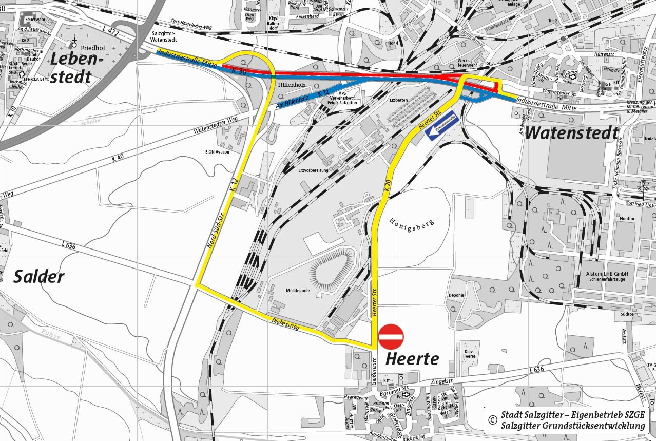 Der Verkehr Richtung Lebenstedt wird von der Industriestraße Mitte (K 30) an der Abfahrt Watenstedt auf die K20 (Heerter Straße) geleitet. Von dort auf der Straße Diebestieg Richtung Westen. An der Kreuzung mit der Nord-Süd-Straße (K12) wird der Verkehr wieder nach Norden zurück auf die Industriestraße geleitet.