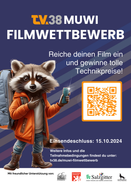 Benannt ist der Wettbewerb nach MUWI, dem Maskottchen des regionalen TV-Senders. Das wurde nach zahlreichen Vorschlägen in einem gemeinsamen Workshop von TV38-Vorstand und hauptamtlichen Team geboren. Saskia Hoog, Vorstandsmitglied Marketing, und Geschäftsführer Jürgen Stricker sind überzeugt: „Unser sympathisch filmender Waschbär wird noch mehr Menschen für das Filmemachen und unseren Bür-gersender begeistern. Jetzt rührt MUWI erstmal die Werbetrommel für unseren Filmwettbewerb. Einen besseren Einstand als Maskottchen kann‘s kaum geben.“ Werbung für den Wettbewerb macht MUWI nicht nur auf den TV38-Kanälen wie Kabel-TV, unter www.tv38.de und auf Social Media, sondern auch auf Litfaßsäulen und anderswo in der Region.