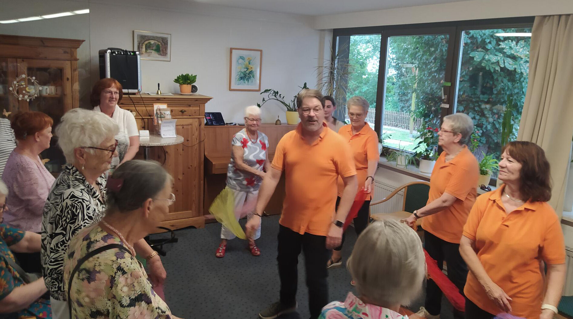 Einer der Höhepunkte des Nachmittags war der Mitmachtanz der Tänzerinnen und Tänzer der Salzgitteraner Tanzschule Kwiatkowski. Sie mussten die Gäste der Infoveranstaltung nicht lange bitten, bei den Tänzen mit bunten Tüchern oder im Sitzen mitzumachen. Schnell war der kleine Raum mit Tanzwilligen gefüllt, die die vorgeführten Tänze mitmachten. Zur Stärkung gab es zwischen den vielen Angeboten Kuchen sowie kleine Snacks und Fingerfood.