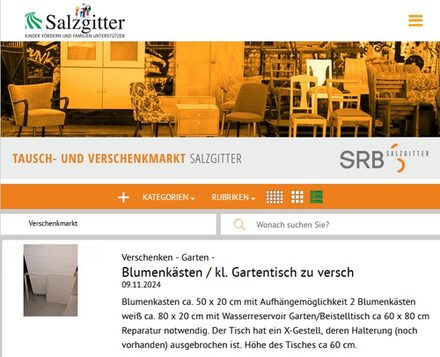 Eine schöne und auch nachhaltige Alternative zum Neukauf ist der Online-Tausch- und Verschenkmarkt, auf den der Städtische Regiebetrieb Salzgitter (SRB) zur Europäischen Woche der Abfallvermeidung, aufmerksam machen möchte. Diese Plattform bietet die Möglichkeit gebrauchte Gegenstände und Möbel zu verschenken, statt sie zu entsorgen. Weitere Kategorien wie leihen, reparieren und suchen leisten wertvolle Beiträge zur Abfallvermeidung, machen den Tausch- und Verschenkmarkt attraktiv und helfen, Abfall zu vermeiden.