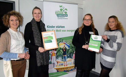 Freuen sich über die neue Netzwerkarbeit und die Zertifizierung der Volkshochschule Salzgitter mit der Plakettenübergabe (von links): Kerstin Tote, Referentin der Stiftung Kinder forschen, Christina Mersch, Bereichsleitung Netzwerke der Stiftung Kinder forschen, Antje Behre und Kristina Wojna, Projektleiterinnen der Volkshochschule.