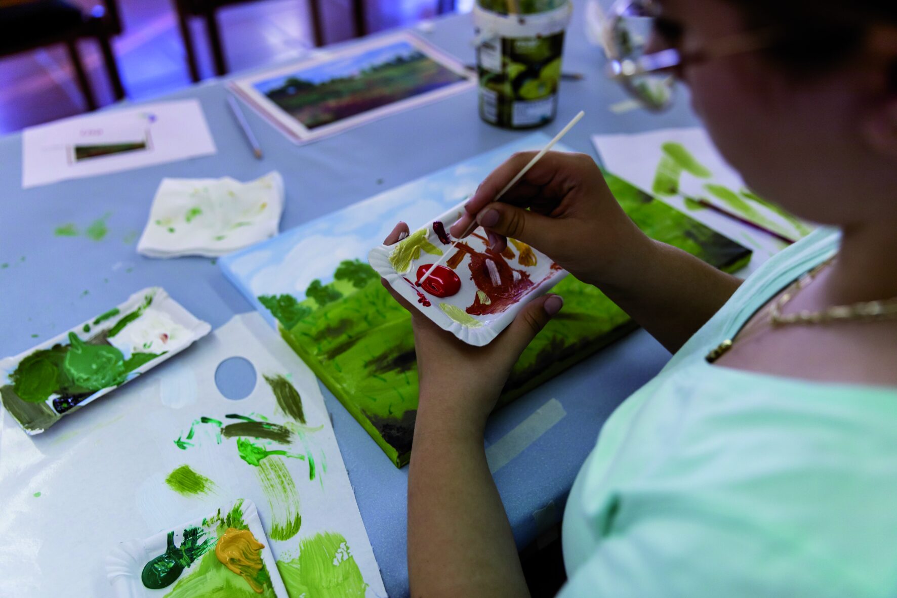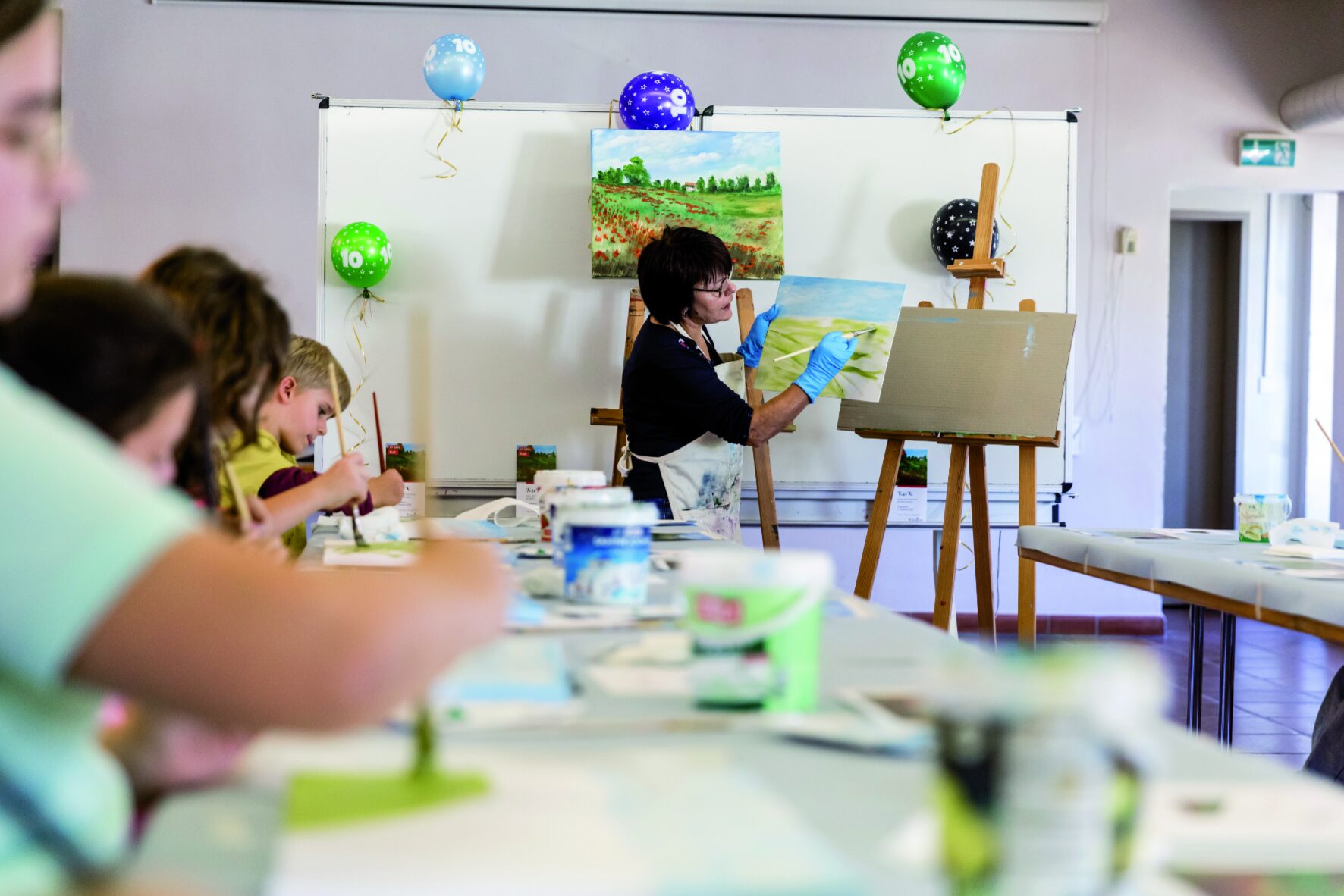 Fast ein Dutzend begeisterter Kinder zwischen acht und 14 Jahren konnten in großer Runde in dem festlich geschmückten Saal gemeinsam malen und kreative Entdeckungen erleben.