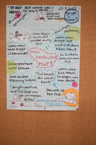 Jeweils zwei Referentinnen des Literaturhauses besuchten die Schulen und ließen auf spielerische Weise mit den Schüler/innen die Gedanken fliegen – insgesamt acht Vormittagsveranstaltungen standen in diesem Jahr auf dem Programm. Ausgehend von sorgfältig ausgewählten Bilderbuchgeschichten wurde über das Thema „Was bedeutet Mut?“ gemeinsam diskutiert und nachgedacht. Es wurde nach Gründen und Zusammenhängen gesucht, vermeintlich Selbstverständliches geprüft und die Kinder konnten ihre eigenen Erfahrungen und Ideen zu dieser zentralen Frage zusammentragen. Nicht selten stellten sie dabei Übereinstimmungen fest, sie tauschten ihre Meinungen aus, formulierten Argumente und hörten sich die jeweiligen der anderen an. Das geschah kreativ, spielerisch, altersgerecht und immer anhand der von den Referentinnen mitgebrachten Bücher und des „Gedankenflieger“-Magazin, das eigens zu dem Thema entwickelt wurde und das die Veranstaltungen begleitete, vertiefte, die Kinder anregte, ihre Gedanken festzuhalten und die gesetzten Impulse weiterzudenken.