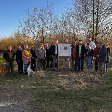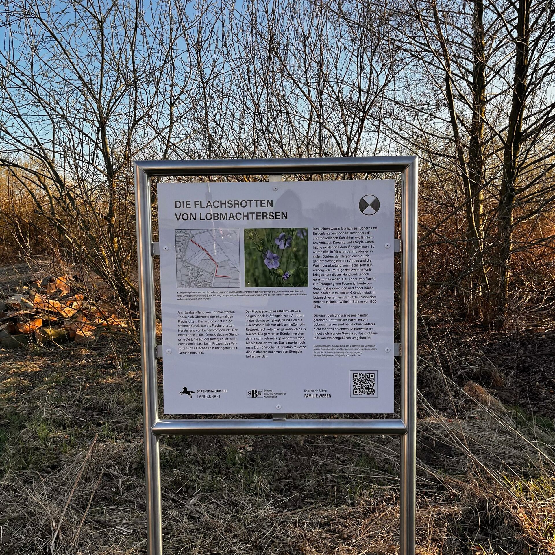 Um dennoch darauf aufmerksam zu machen, hat die Arbeitsgruppe Heimatpfleger der Braunschweigischen Landschaft dort eine weitere ihrer archäologischen Hinweistafeln aufgestellt. Jörg Karlauf, Ortsheimatpfleger von Lobmachtersen hat die Informationen in Zusammenarbeit mit dem Stadtarchiv der Stadt Salzgitter zusammengetragen. Die Hinweistafel zu den Flachsrotten Lobmachtersens wurde am 27. März 2025 im Beisein von Jan Erik Bohling (Kulturdezernent der Stadt Salzgitter), Katrin Helm (Stadtarchiv der Stadt Salzgitter), Jörg Karlauf (Ortsheimatpfleger Lobmachtersen), Anna Lamprecht (Geschäftsstellenleiterin Braunschweigische Landschaft e.V.) und Harald Schraepler (Sprecher der AG Heimatpflege der Braunschweigischen Landschaft e.V.) enthüllt.
