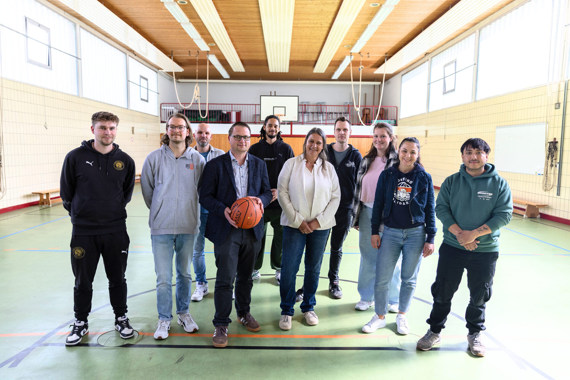 Neues, offenes Angebot für Kinder- und Jugendliche in Salzgitter: Organisatoren und Kooperationspartner feiern den Start von „BasKIDball“ in der Sporthalle der Montessori-Schule in Lebenstedt (v.l.: Bastian Wald (Projektmitarbeiter „LöwenZukunft“, Basketball Löwen Braunschweig), Markus Meisner (Projektleiter „LöwenZukunft“, Basketball Löwen Braunschweig), Schulleiter Christian Wienecke, Marco Schmitz (Fachdienstleitung Kinder, Jugend und Familie der Stadt Salzgitter), Flavio Stückemann (Trainer Basketball Löwen Braunschweig), Martina Malak (Stadtjugendpflegerin), André Blase (Teamleitung Jugend im Gemeinwesen), Lorena Raups (Schulsozialarbeiterin), Angelique Bekurts und Carsten Langer Valverde (beide Team Jugend im Gemeinwesen).