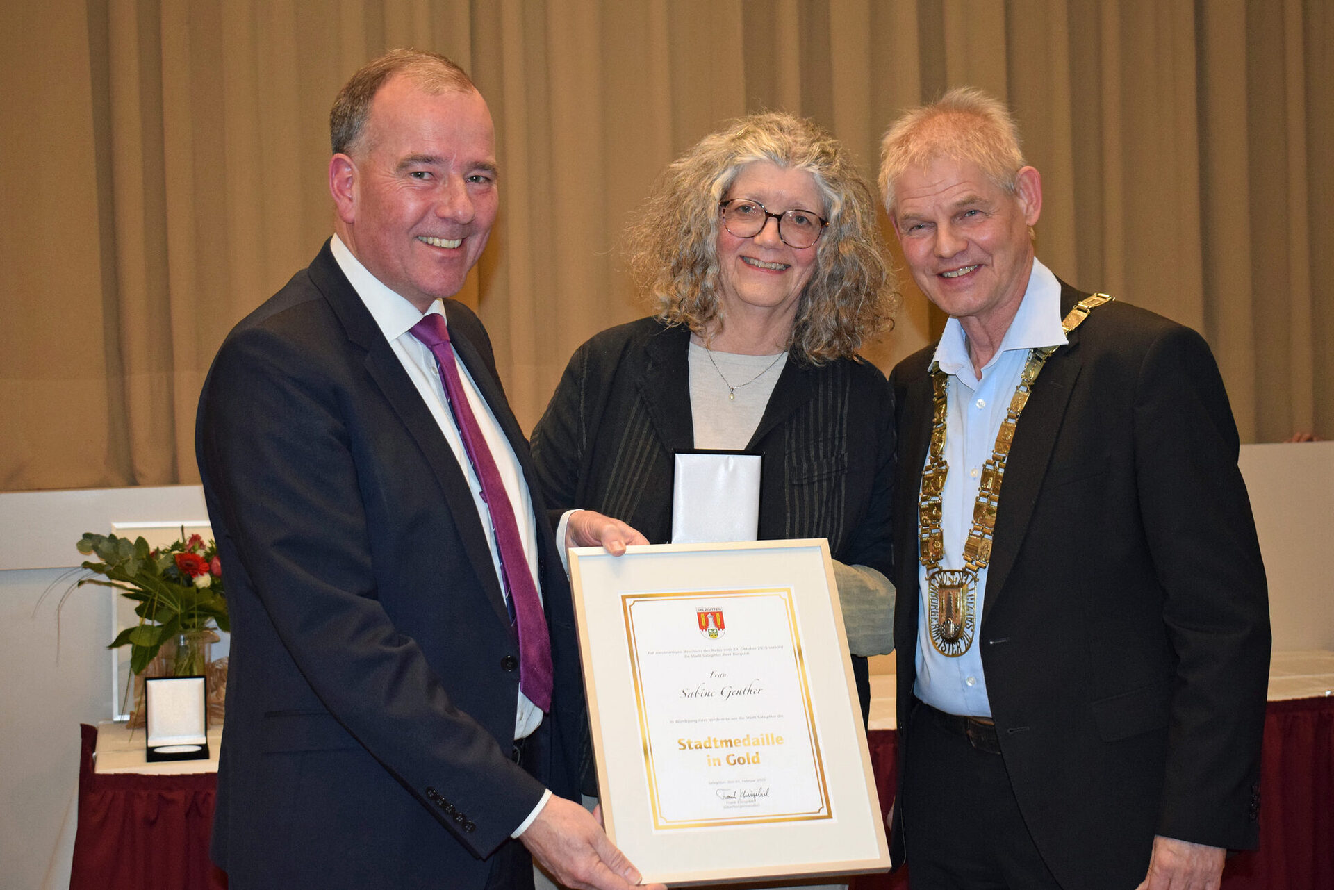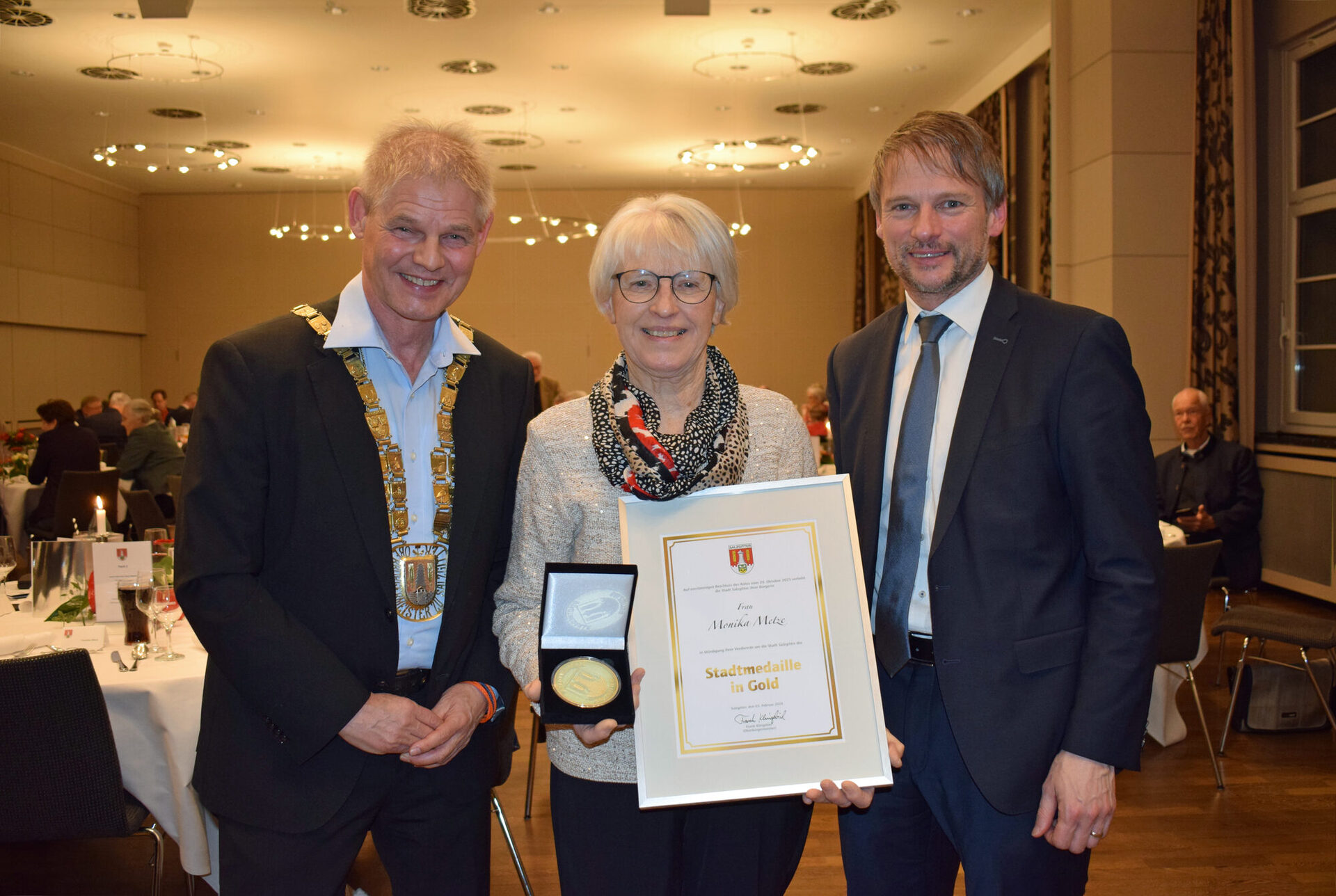 Verleihung der Stadtmedaille in Gold an Monika Metze (v. l. Oberbürgermeister Frank Klingebiel, Stadtmedaillenträgerin Monika Metze und Erster Bürgermeister Stefan Klein)