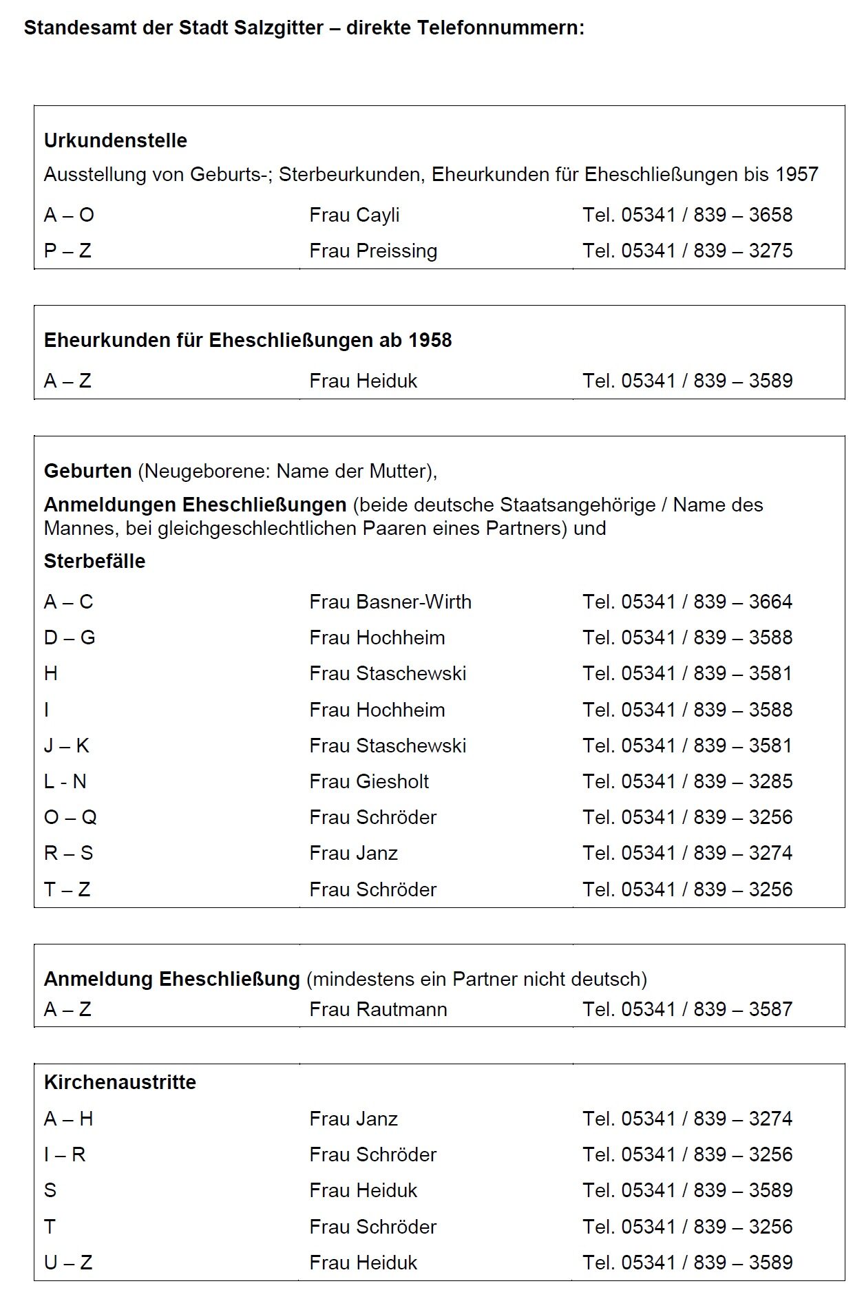 Für weitere Fragen können Sie sich an die zuständigen Standesbeamtinnen und Standesbeamten wenden oder per E-Mail an: standesamtstadt.salzgitterde