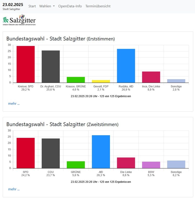 Das amtliche Teilergebnis der Stadt Salzgitter aufgeteilt nach Erst- und Zweitstimmen kann nachfolgend eingesehen werden: